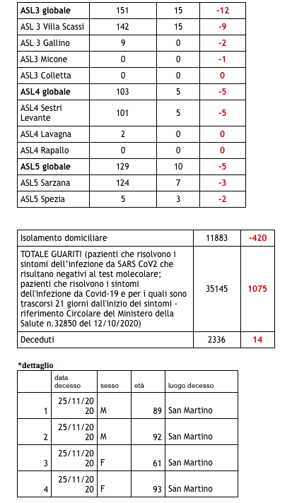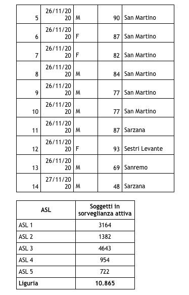 Sono 2336 i morti con coronavirus in Liguria, con un aumento rispetto a quanto comunicato ieri di quattordici (donne e uomini da 48 a 93 anni).