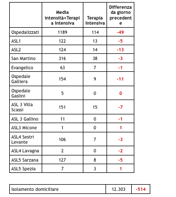 Ecco il bollettino di oggi con tutti i dati ufficiali inviati da Regione Liguria al ministero della Salute.