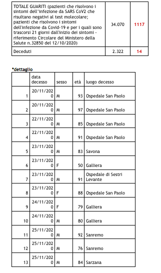 Sono 2322 i morti con coronavirus in Liguria, con un aumento rispetto a quanto comunicato ieri di quattordici (donne e uomini da 50 a 97 anni). Ieri i deceduti erano stati 22.