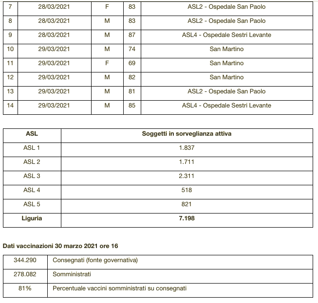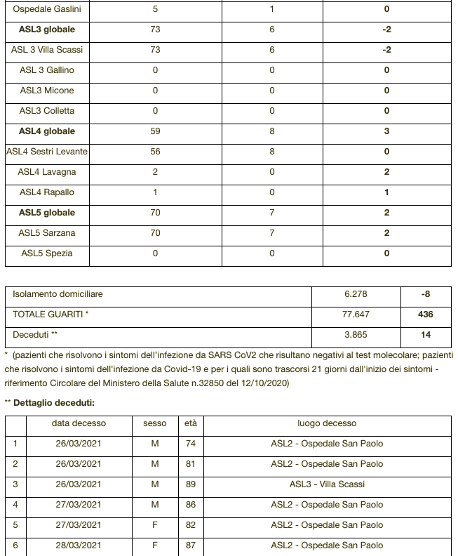 Sono 3.865 i morti con coronavirus in Liguria, con un aumento rispetto a quanto comunicato ieri da Regione Liguria di quattordici (donne e uomini da 69 a 89 anni) di cui solo 5 decessi si riferiscono alle ultime 24 ore.