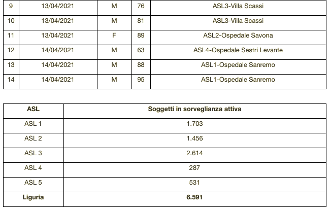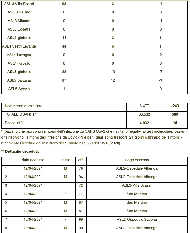 Sono 4.032 i morti con coronavirus in Liguria, con un aumento rispetto a quanto comunicato ieri da Regione Liguria di quattordici (donne e uomini dai 63 a 95 anni) di cui solo sette decessi si riferiscono alle ultime 24 ore.