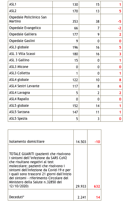 I flussi della Liguria sono stati allineati come indicato dall’Istituto superiore di sanità, considerando nei casi guariti, oltre ai pazienti che risultano negativi al test molecolare, anche quelli che risolvono i sintomi dell’infezione da Covid-19 e per i quali sono trascorsi 21 giorni dall’inizio dei sintomi previa valutazione di esperti clinici e microbiologi/virologi (riferimento Circolare del Ministero della Salute n.32850 del 12/10/2020).