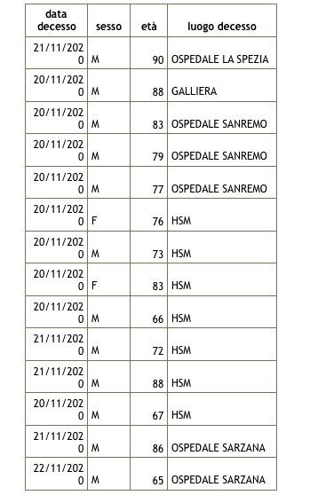 Sono 2241 i morti con coronavirus in Liguria, con un aumento rispetto a quanto comunicato ieri di quattordici (donne e uomini da 65 a 90 anni).