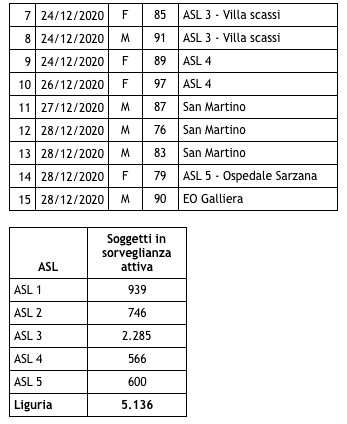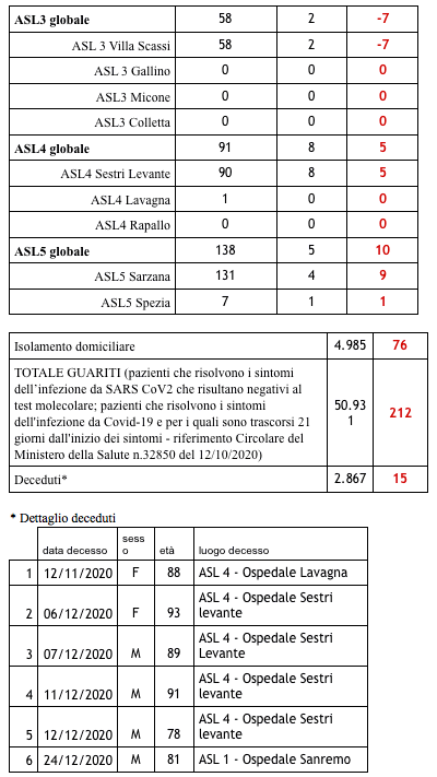 Sono 2.867 i morti con coronavirus in Liguria, con un aumento rispetto a quanto comunicato ieri di quindici (uomini e donne di 76 e 93 anni).
