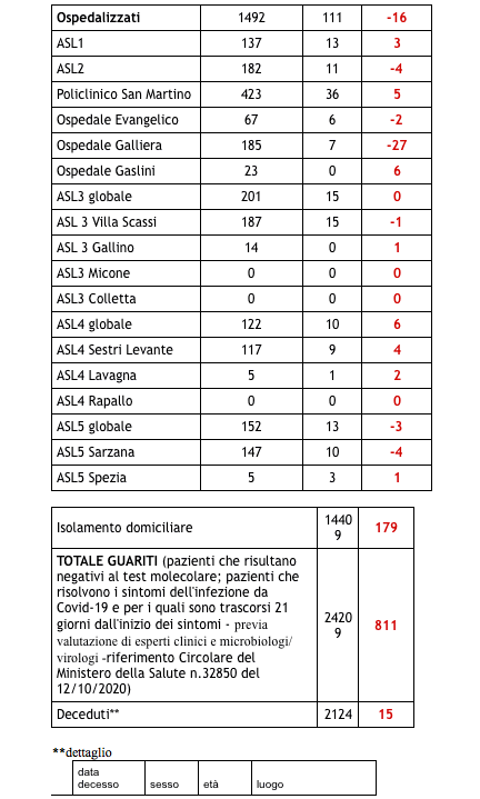 Sono 2124 i morti con coronavirus in Liguria, con un aumento rispetto a quanto comunicato ieri di quindici (donne e uomini da 68 a 98 anni).