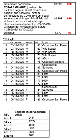 Sono 1.879 i morti con coronavirus in Liguria, con un aumento rispetto a ieri di sedici morti (uomini e donne da 69 a 95 anni).