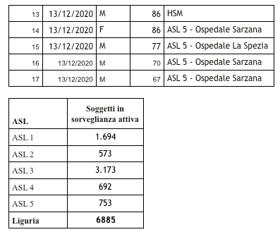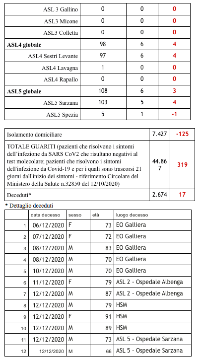 Sono 2.674 i morti con coronavirus in Liguria, con un aumento rispetto a quanto comunicato ieri di diciassette (donne e uomini da 66 a 91 anni).