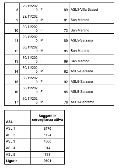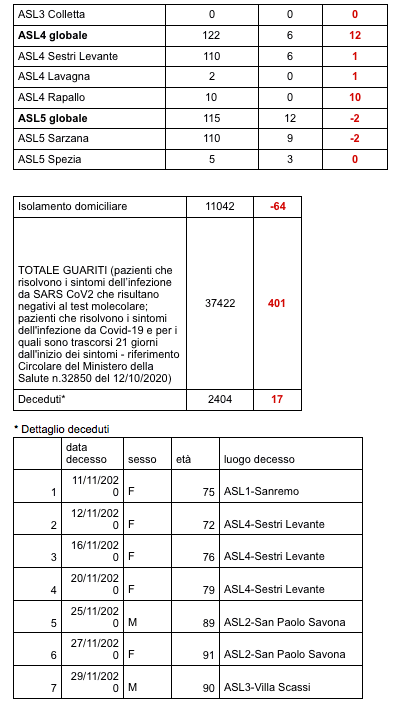 Sono 2404 i morti con coronavirus in Liguria, con un aumento rispetto a quanto comunicato ieri di diciassette (donne e uomini da 72 a 92 anni).