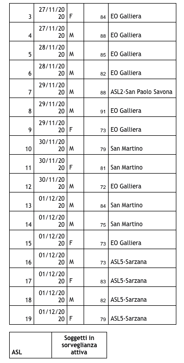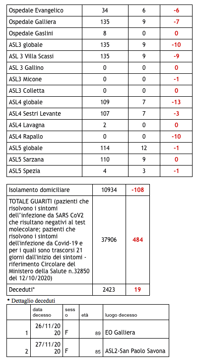 Sono 2423 i morti con coronavirus in Liguria, con un aumento rispetto a quanto comunicato ieri di diciannove (donne e uomini da 72 a 91 anni).