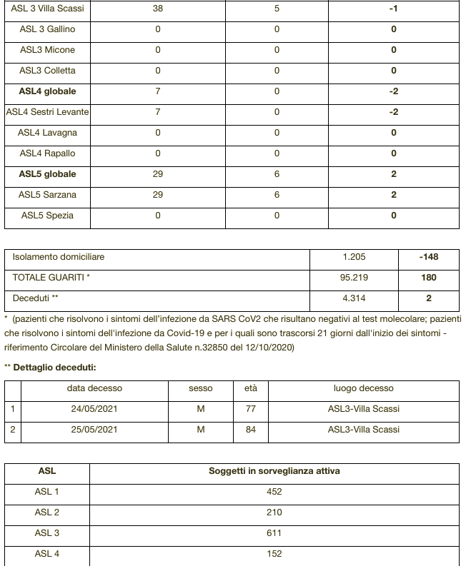 Genova, 26 maggio. Sono 4.314 i morti con coronavirus in Liguria, con un aumento rispetto a quanto comunicato ieri da Regione Liguria di due (maschi di 77 e 84 anni deceduti ieri e l’altro ieri al Villa Scassi).