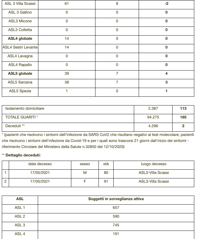Sono 4.296 i morti con coronavirus in Liguria, con un aumento rispetto a quanto comunicato ieri da Regione Liguria di due (maschio di 80 anni e femmina di 91 anni deceduti l’altro ieri al Villa Scassi).