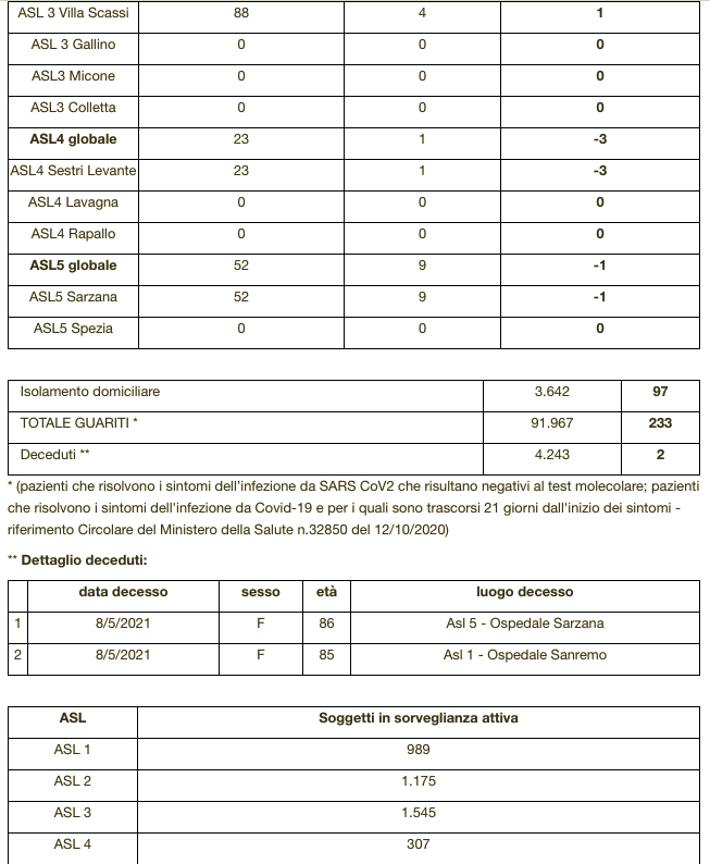 Ecco il bollettino di oggi con tutti i dati ufficiali inviati da Regione Liguria al ministero della Salute.