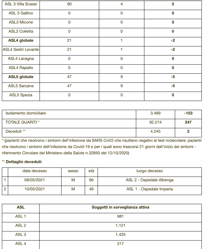 Sono 4.245 i morti con coronavirus in Liguria, con un aumento rispetto a quanto comunicato ieri da Regione Liguria di due (un 66enne deceduto l’otto maggio e un 49enne deceduto oggi).