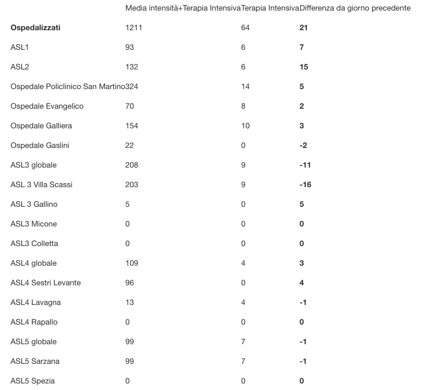 Ecco il bollettino di oggi con tutti i dati ufficiali inviati da Regione Liguria al ministero della Salute.