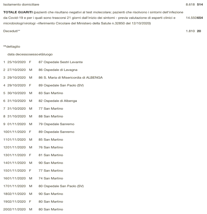 Sono 1810 i morti con coronavirus in Liguria, con un aumento rispetto a ieri di venti morti (uomini e donne da 74 a 90 anni).