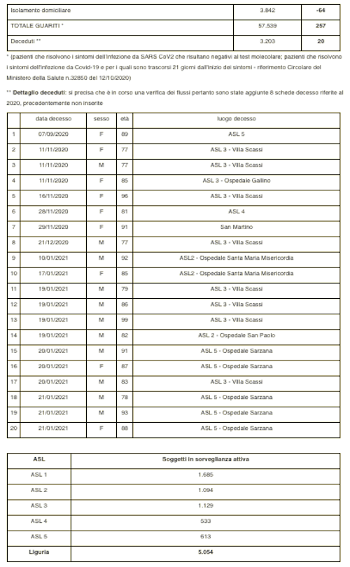 Sono 3.203 i morti con coronavirus in Liguria, con un aumento rispetto a quanto comunicato ieri da Regione Liguria di venti (uomini e donne da 77 a 96 anni).