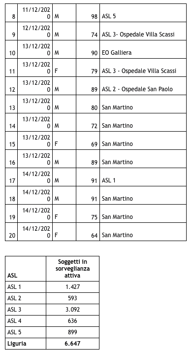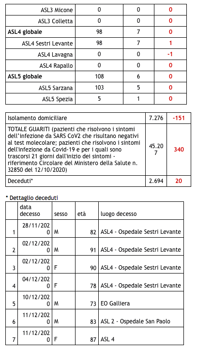 Sono 2.694 i morti con coronavirus in Liguria, con un aumento rispetto a quanto comunicato ieri di venti (donne e uomini da 64 a 98 anni).