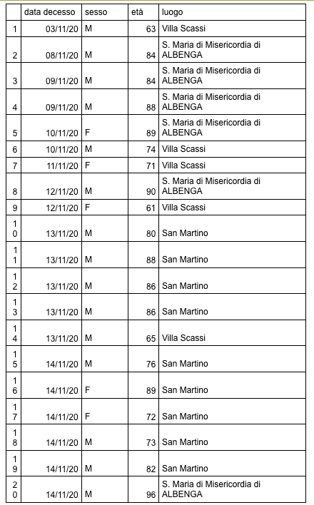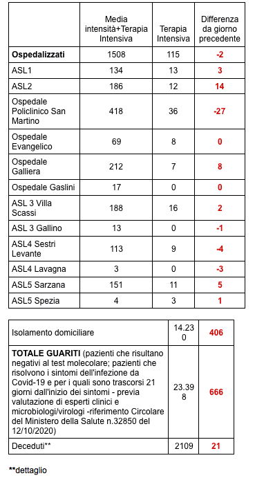 Sono 2109 i morti con coronavirus in Liguria, con un aumento rispetto a quanto comunicato ieri di ventuno (donne e uomini da 61 a 96 anni).