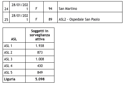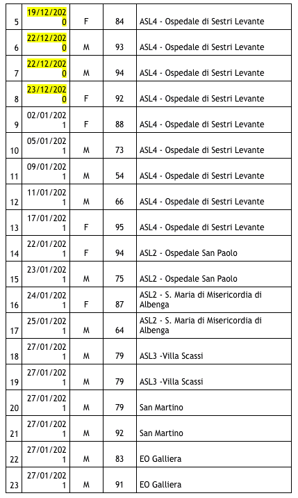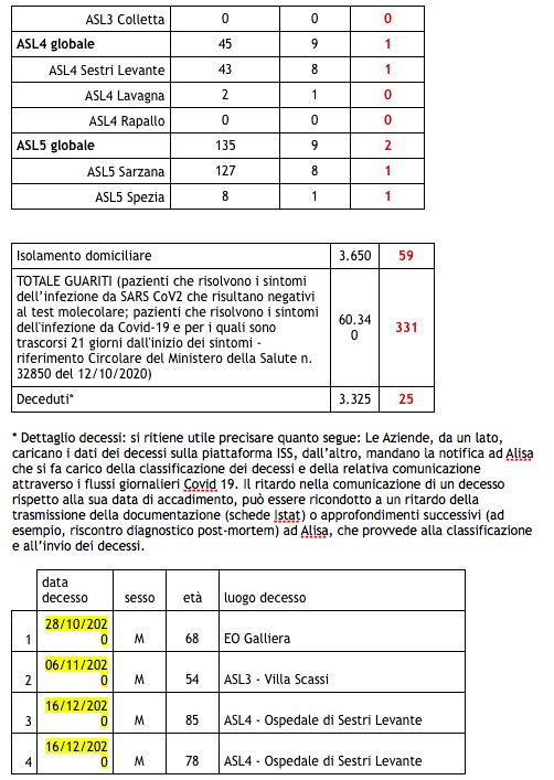 Sono 3.325 i morti con coronavirus in Liguria, con un aumento rispetto a quanto comunicato ieri da Regione Liguria di venticinque (uomini e donne da 54 a 95 anni).