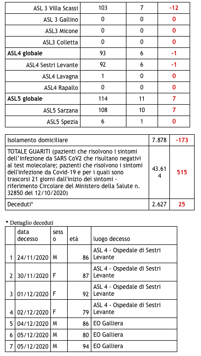 Ecco il bollettino di oggi con tutti i dati ufficiali inviati da Regione Liguria al ministero della Salute.