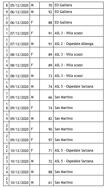 Sono 2627 i morti con coronavirus in Liguria, con un aumento rispetto a quanto comunicato ieri di venticinque (donne e uomini da 66 a 97 anni).