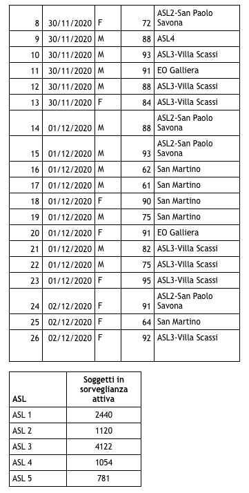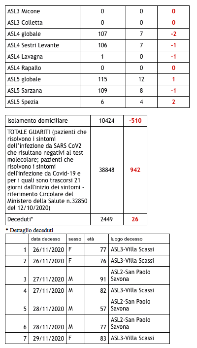 Sono 2449 i morti con coronavirus in Liguria, con un aumento rispetto a quanto comunicato ieri di ventisei (donne e uomini da 57 a 95 anni).