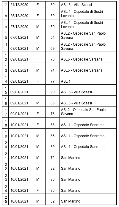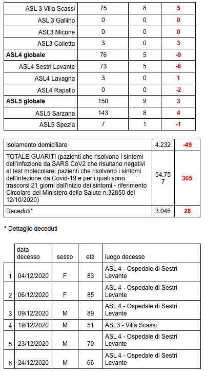 Sono 3046 i morti con coronavirus in Liguria, con un aumento rispetto a quanto comunicato ieri di ventotto (uomini e donne da 51 a 90 anni).