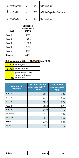 Ecco il bollettino di oggi con tutti i dati ufficiali inviati da Regione Liguria al ministero della Salute.