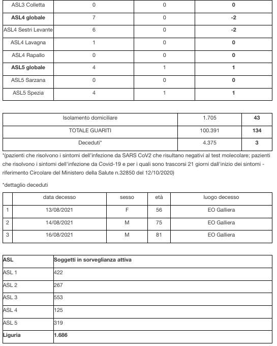 Ecco il bollettino di oggi con tutti i dati ufficiali inviati da Regione Liguria al ministero della Salute.