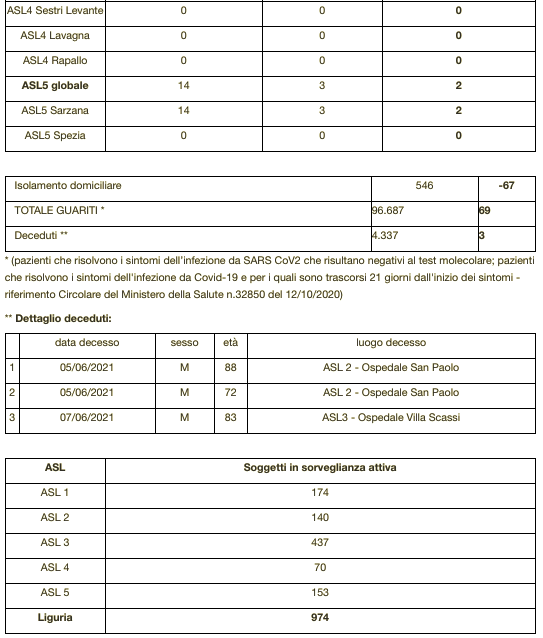 Ecco il bollettino di oggi con tutti i dati ufficiali inviati da Regione Liguria al ministero della Salute.