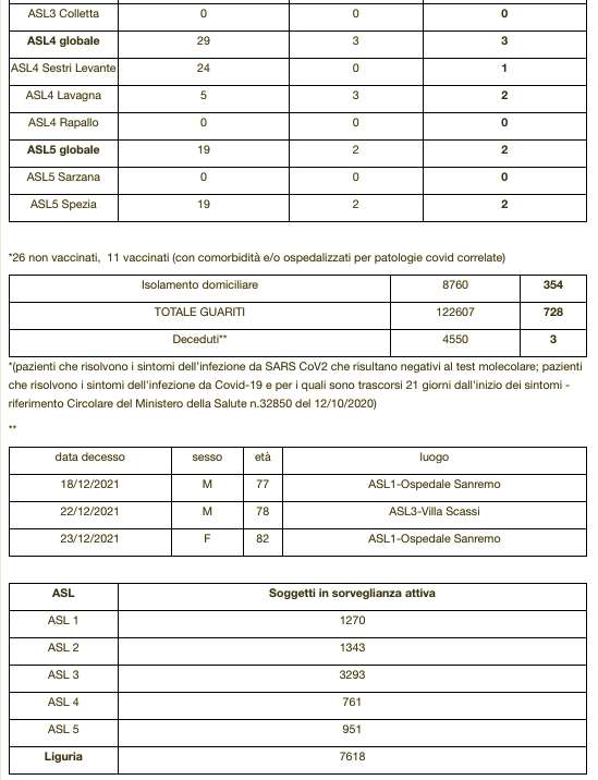 Ecco il bollettino di oggi con tutti i dati ufficiali della Regione Liguria al ministero della Salute.