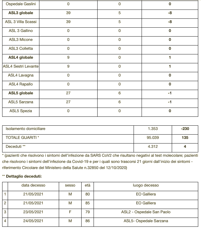 Sono 4.312 i morti con coronavirus in Liguria, con un aumento rispetto a quanto comunicato ieri da Regione Liguria di quattro (maschi e femmine da 79 a 86 anni) di cui soltanto uno dei decessi comunicati oggi da Regione Liguria si riferisce alle ultime 24 ore.