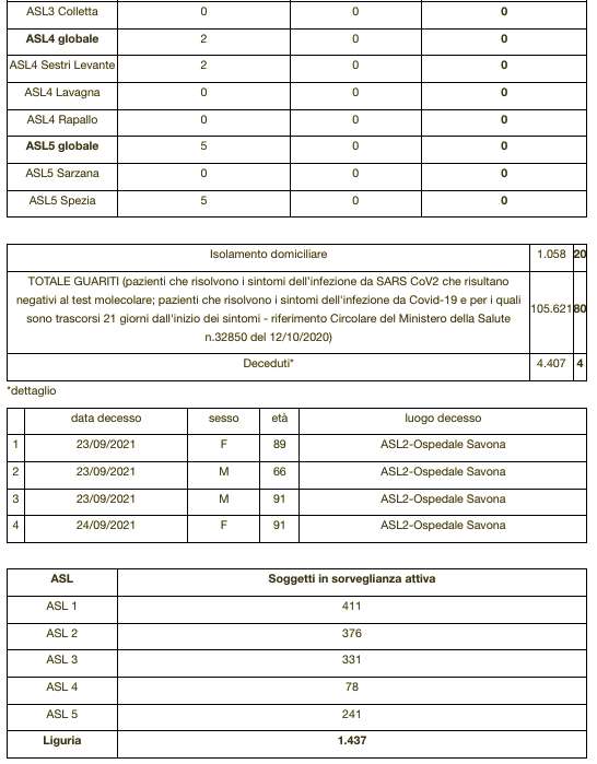 Genova, 25 settembre. Sono 4.407 i morti con coronavirus con un aumento rispetto a quanto comunicato ieri da Regione Liguria di quattro (maschi di 66 e 91 anni e femmine di 89 e 91 anni, tutti deceduti all’ospedale di Savona il 23 e 24 settembre).