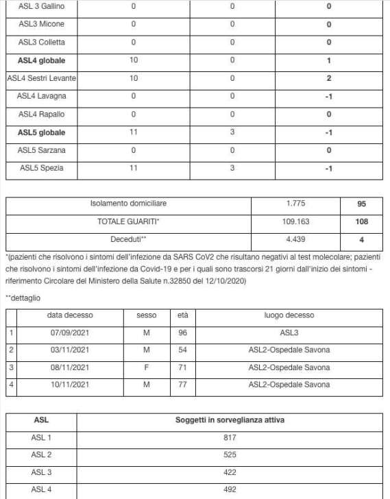 Genova, 12 novembre. Sono 4.439 i morti con coronavirus con un aumento rispetto a quanto comunicato ieri da Regione Liguria di quattro (maschio di 96 anni deceduto il 7 settembre in Asl 3 Genovese, maschi di 54 e 77 anni e femmina di 71 anni deceduti il 3, 8 e 11 novembre all’ospedale di Savona).