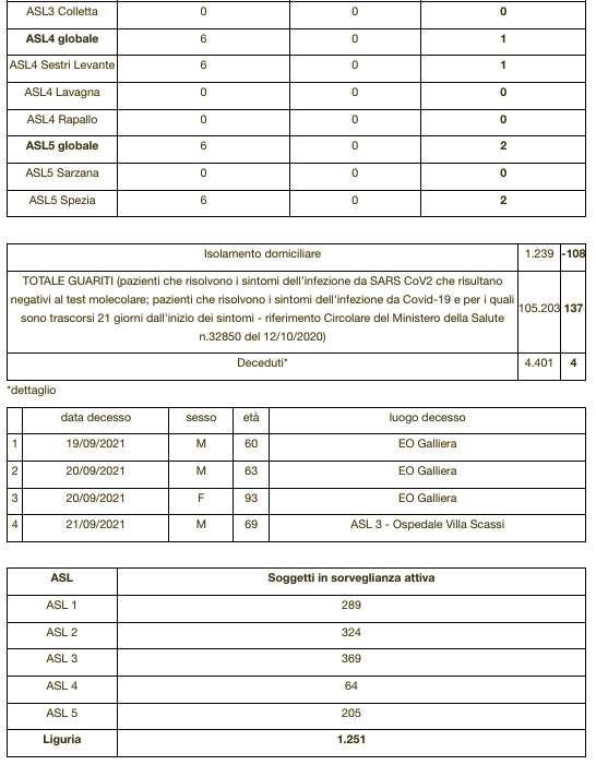 Genova, 21 settembre. Sono 4.401 i morti con coronavirus con un aumento rispetto a quanto comunicato ieri da Regione Liguria di quattro (maschi di 60, 63, 69 anni e una femmina di 93 anni, deceduti tra il 19 e il 21 settembre al Galliera e al Villa Scassi di Genova).
