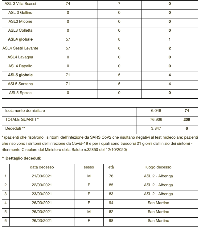 Sono 3.841 i morti con coronavirus in Liguria, con un aumento rispetto a quanto comunicato ieri da Regione Liguria di sei (donne e uomini da 76 a 98 anni) di cui nessun decesso si riferisce alle ultime 24 ore.