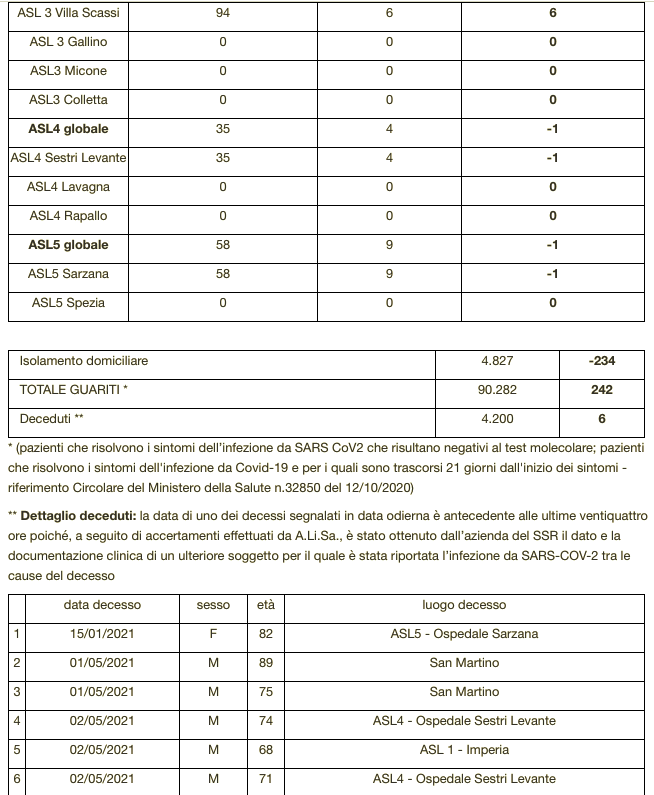 Sono 4.200 i morti con coronavirus in Liguria, con un aumento rispetto a quanto comunicato ieri da Regione Liguria di sei (femmine e maschi da 68 a 89 anni) di cui solo tre decessi si riferiscono alle ultime 24 ore.