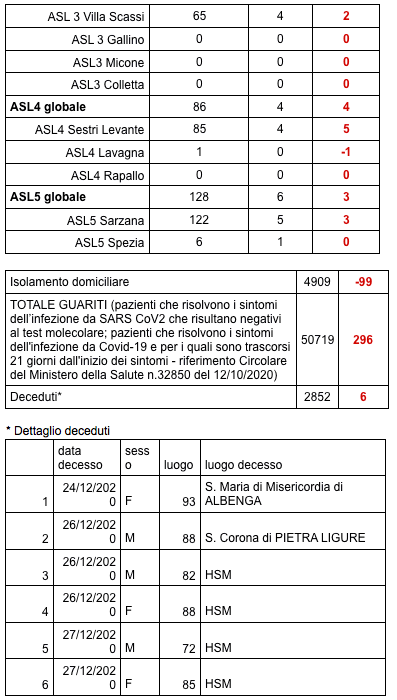 Sono 2.852 i morti con coronavirus in Liguria, con un aumento rispetto a quanto comunicato ieri di sei (uomini e donne di 82 e 93 anni).