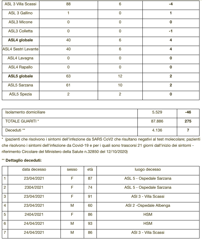 Sono 4.136 i morti con coronavirus in Liguria, con un aumento rispetto a quanto comunicato ieri da Regione Liguria di sette (femmine e maschi dai 60 ai 93 anni) di cui solo tre decessi si riferiscono alle ultime 24 ore.
