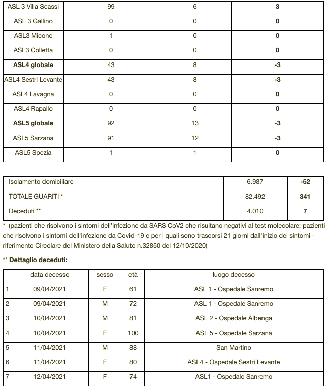 Sono 4.010 i morti con coronavirus in Liguria, con un aumento rispetto a quanto comunicato ieri da Regione Liguria di sette (donne e uomini dai 61 a 100 anni) di cui solo tre decessi si riferiscono alle ultime 24 ore.