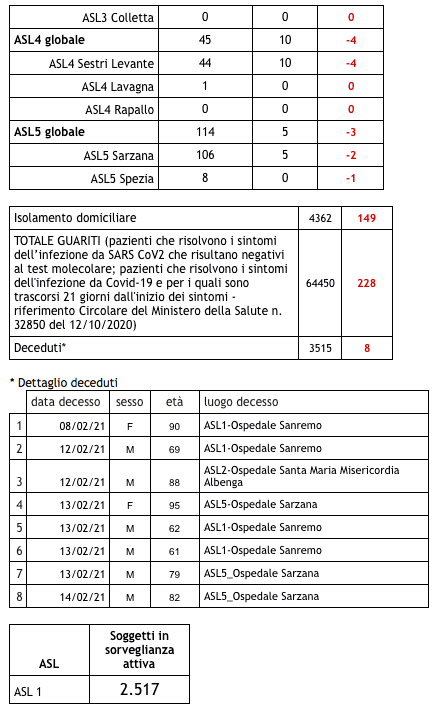 Sono 3.515 i morti con coronavirus in Liguria, con un aumento rispetto a quanto comunicato ieri da Regione Liguria di otto (uomini e donne da 61 a 95 anni).