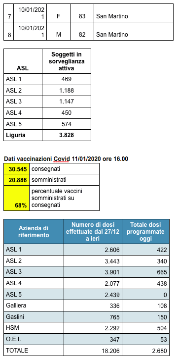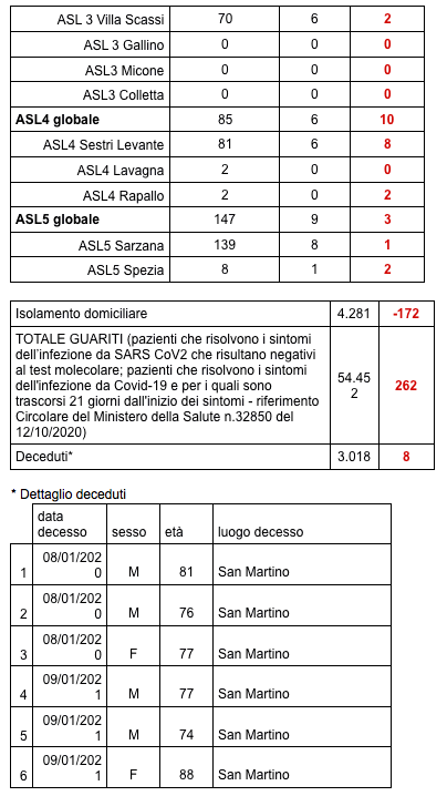 Sono 3018 i morti con coronavirus in Liguria, con un aumento rispetto a quanto comunicato ieri di otto (uomini e donne da 74 a 88 anni).