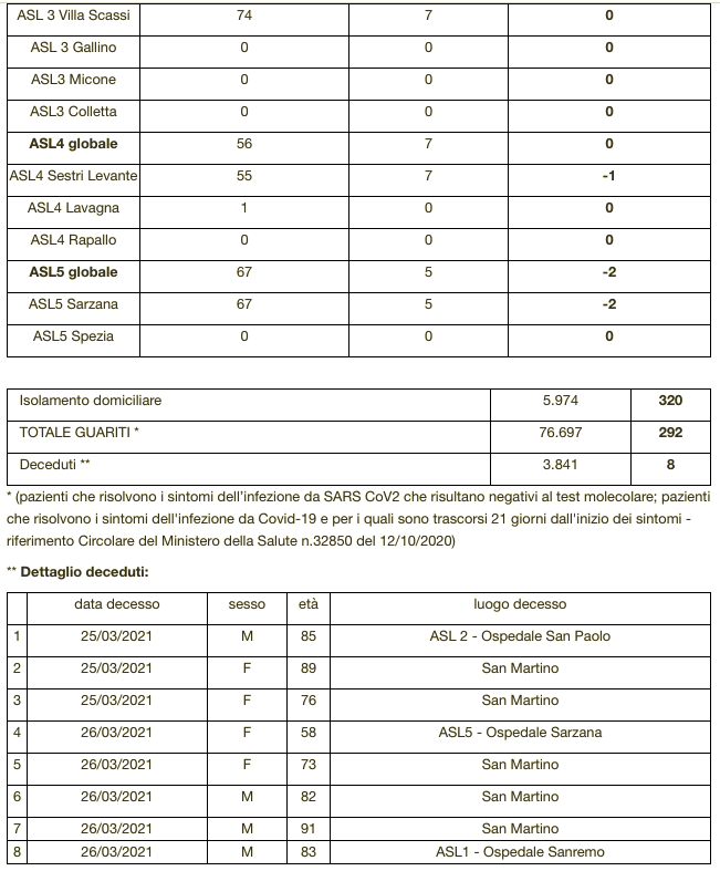 Sono 3.841 i morti con coronavirus in Liguria, con un aumento rispetto a quanto comunicato ieri da Regione Liguria di otto (donne e uomini da 58 a 91 anni) di cui cinque decessi si riferiscono alle ultime 24 ore.