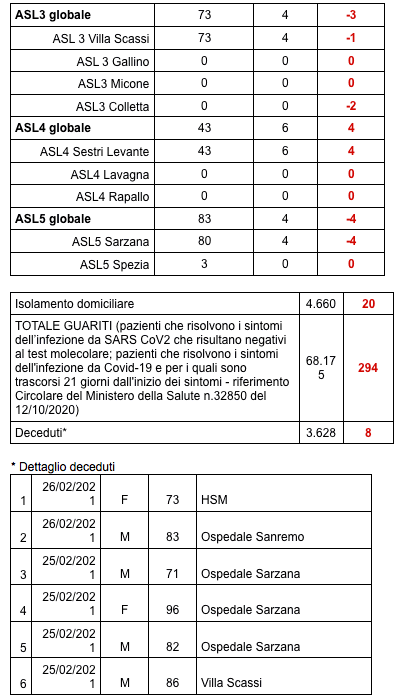 Sono 3.628 i morti con coronavirus in Liguria, con un aumento rispetto a quanto comunicato ieri da Regione Liguria di otto (donne e uomini da 71 a 96 anni).