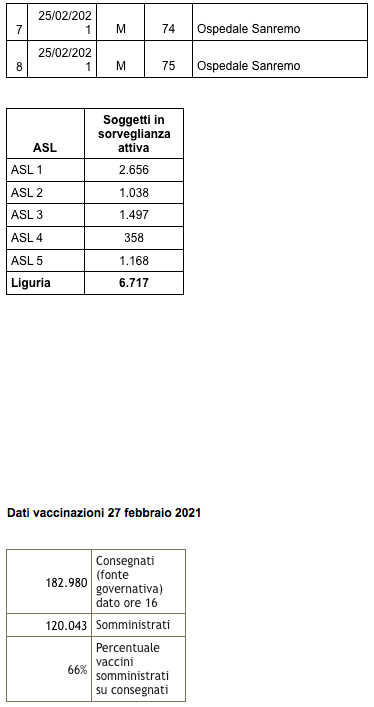 Ecco il bollettino di oggi con tutti i dati ufficiali inviati da Regione Liguria al ministero della Salute.