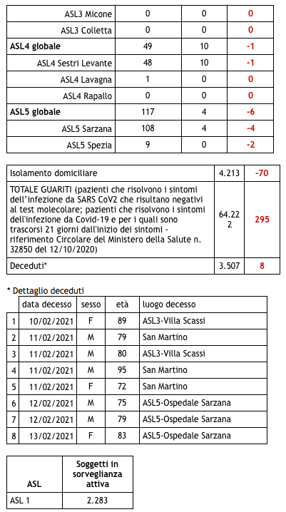 Sono 3.507 i morti con coronavirus in Liguria, con un aumento rispetto a quanto comunicato ieri da Regione Liguria di otto (uomini e donne da 72 a 95 anni).