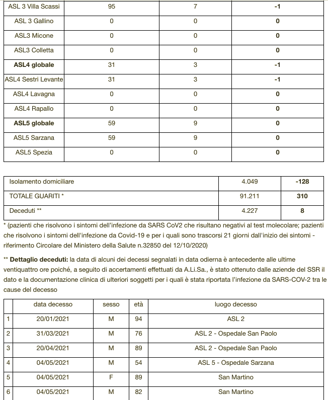 Sono 4.227 i morti con coronavirus in Liguria, con un aumento rispetto a quanto comunicato ieri da Regione Liguria di otto (femmine e maschi da 54 a 94 anni) di cui nessun decesso si riferisce alle ultime 24 ore.