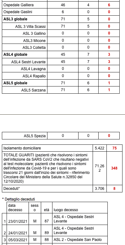 Sono 3.706 i morti con coronavirus in Liguria, con un aumento rispetto a quanto comunicato ieri da Regione Liguria di otto (donne e uomini da 69 a 89 anni) di cui soltanto tre si riferiscono a ieri.
