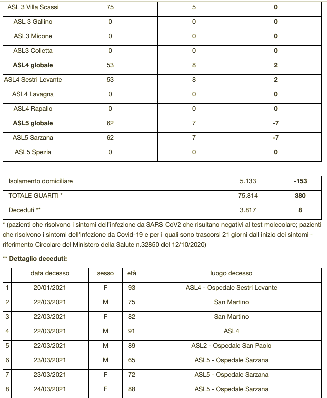 Sono 3.817 i morti con coronavirus in Liguria, con un aumento rispetto a quanto comunicato ieri da Regione Liguria di otto (donne e uomini da 65 a 93 anni) di cui solo tre decessi si riferiscono alle ultime 24 ore.