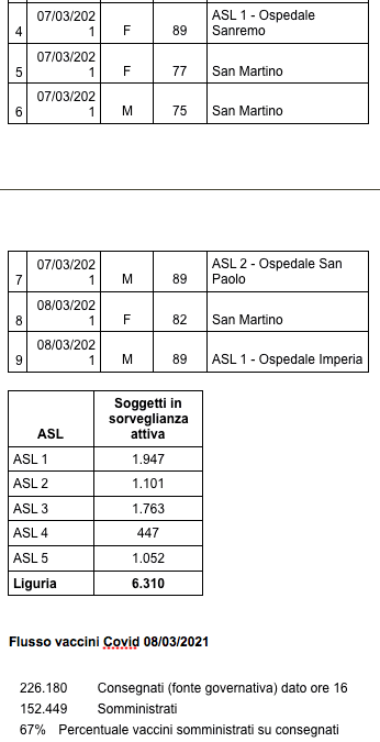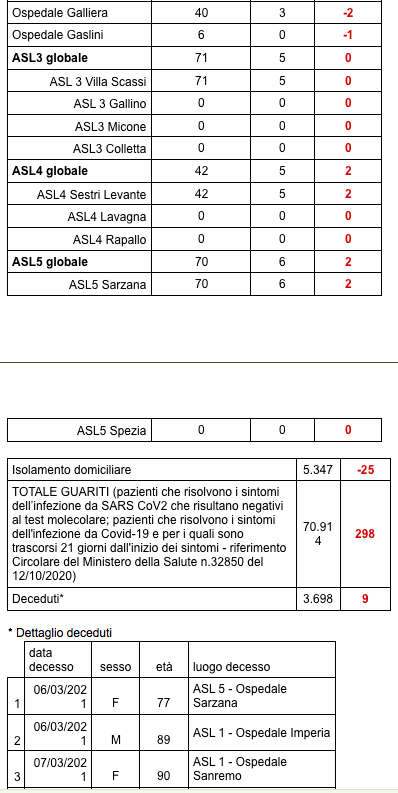 Sono 3.698 i morti con coronavirus in Liguria, con un aumento rispetto a quanto comunicato ieri da Regione Liguria di nove (donne e uomini da 75 a 90 anni) di cui sette decessi sono avvenuti tra sabato e domenica scorsi.